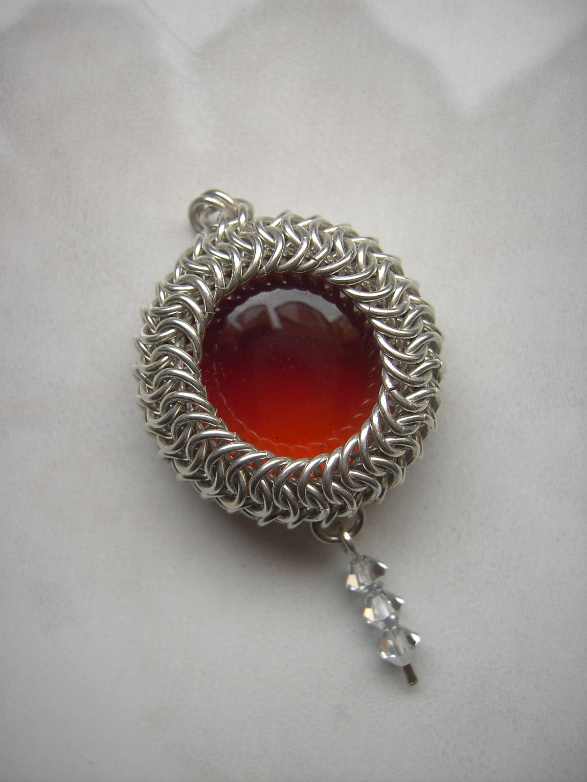 Chainmaille bezel for a glass cabochon made from sterling silver rings and embellished with Swarovski crystals