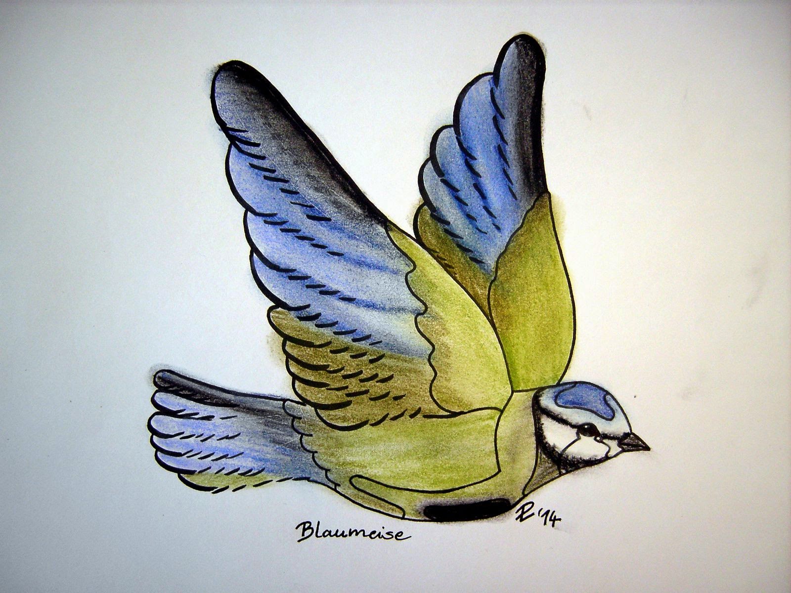 Aus dem Vogel ist nun eine Blaumeise (Parus caeruleus) geworden und zwar mit Hilfe von Pastellkreiden. An den Kreiden mag ich besonders, wie sich die Farbübergänge gestalten lassen, besonders bei Federn und Fell von Tieren. Ich liebe diese Farben! Und hier geht's zum PPF!
