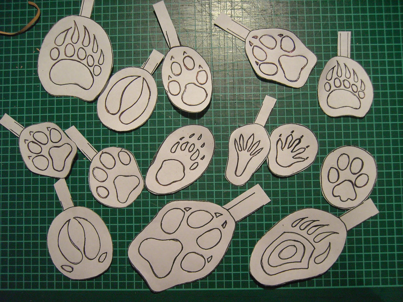 Und hier seht ihr ein Bild von den Papiervorlagen, die ich für die Pfotenanhänger gezeichnet habe. Es gibt Katzen, Hunde, Luchse, Igel, Dachse, Waschbären, Wölfe, Bären, Wildschweine, Rehe und Hirsche. Erkennt ihr alle?