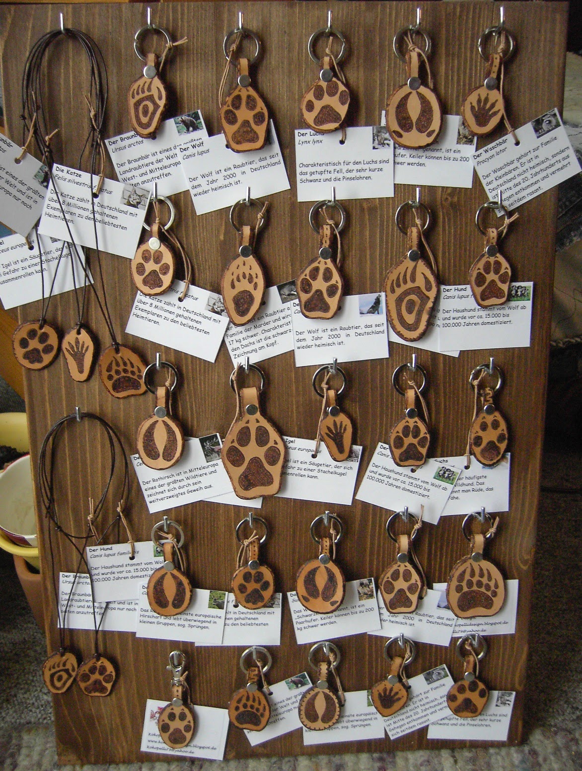 Mein Display mit den Schlüsselanhängern ist voll. Und einige habe ich noch in Reserve. Die Anhänger sind mit einer kleinen Karte versehen, auf der Infos über das jeweilige Tier und meine Arbeit stehen. Ich verkaufe sie für 4 Euro.