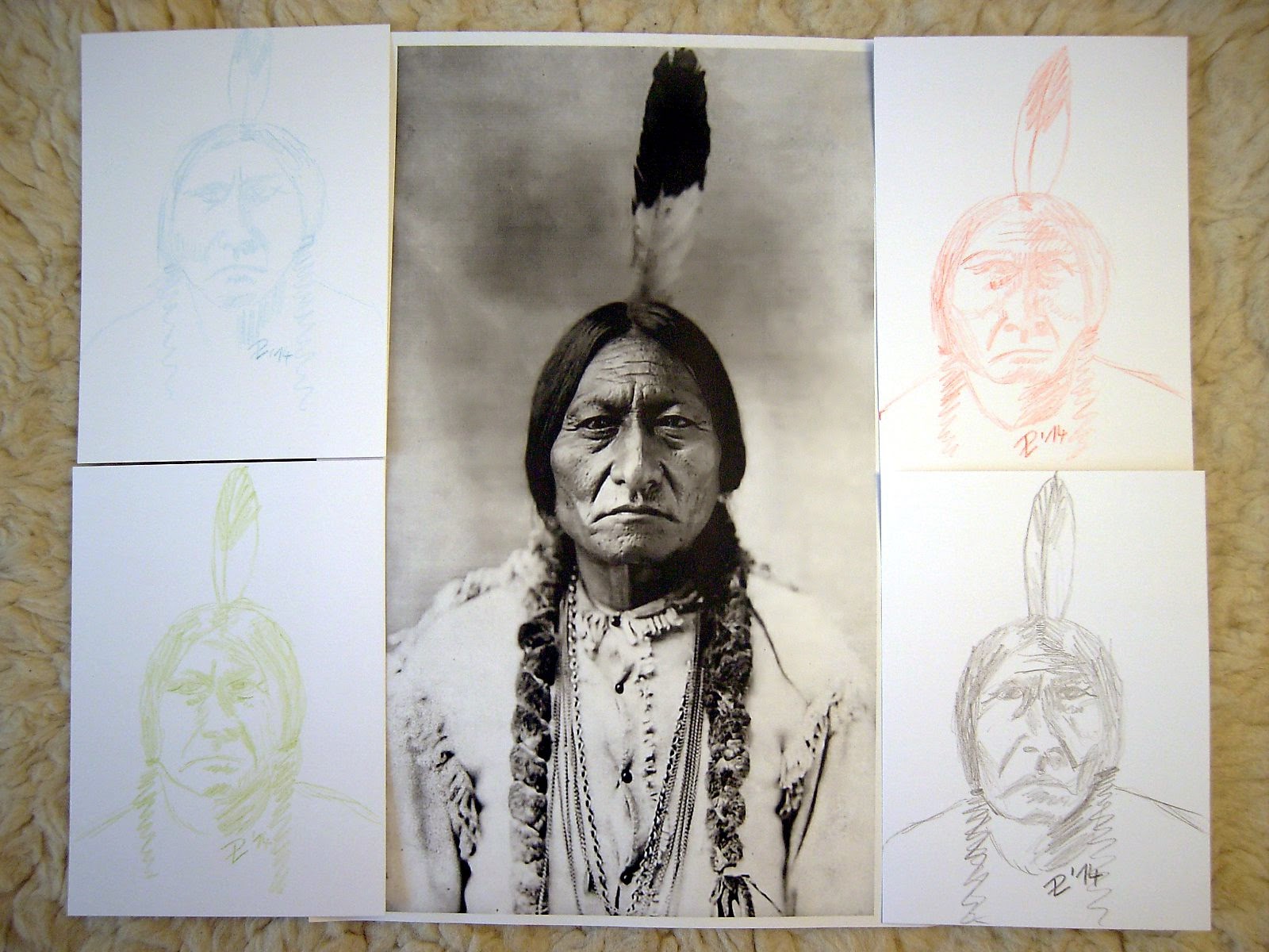 Ich bin ein bißchen spät dran für den PPF, aber hier sind meine Zeichnungen. Ich habe mich entschieden, einige Lektionen einer Zeichenklasse, die ich 2011 gemacht habe, nochmal zu machen. Zeichnen nach Fotos war eine dieser Lektionen und ich habe ein Bild des berühmten Hunkpapa-Häuptlings Tatanka Yotanka (Sitting Bull) genommen. Ich habe ihn viermal gezeichnet, jedes Mal mit einer anderen Farbe. Mir gefallen die verschiedenen Gesichtsausdrücke!