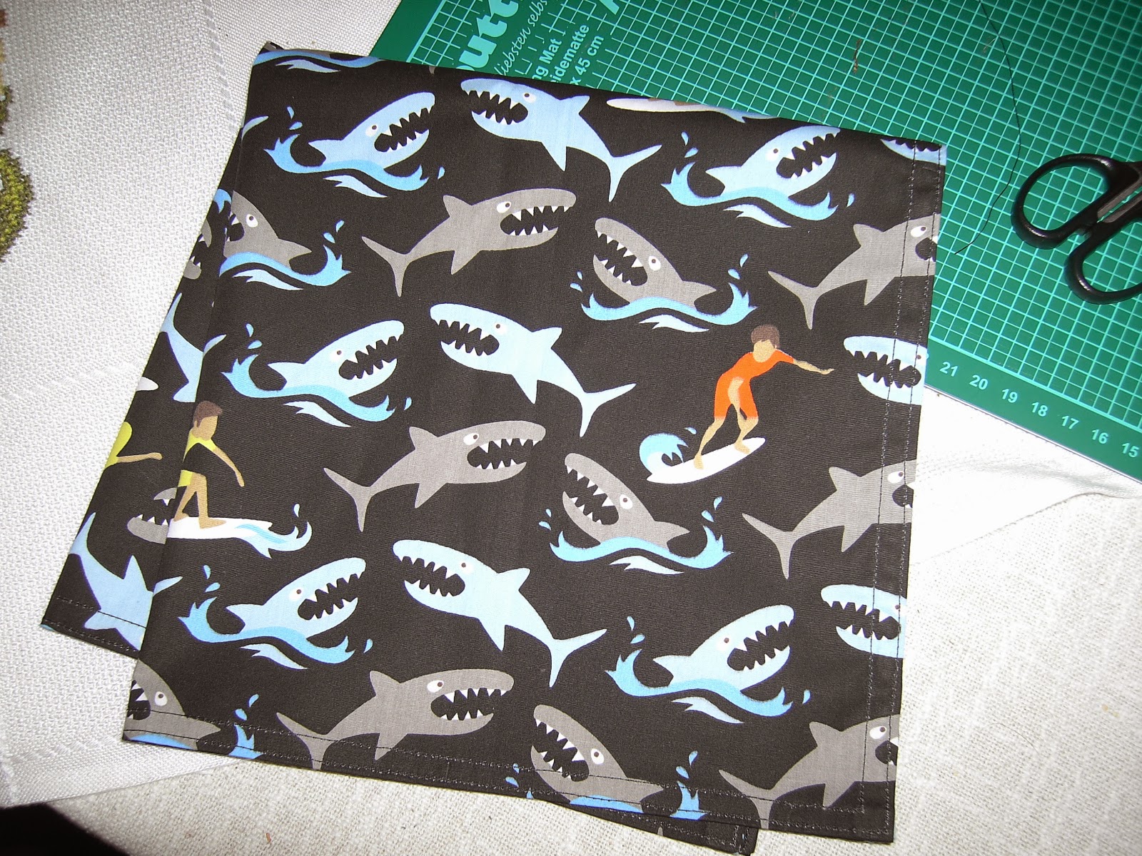 Haifisch-Surfer-Halstuch für eine junge Piratenlady: Sie ließ über ihre Mutter ausrichten, dass sie gerne auch so ein Halstuch wie ich hätte. Und natürlich erfülle ich den Wunsch, da morgen ihr Geburtstag ist.