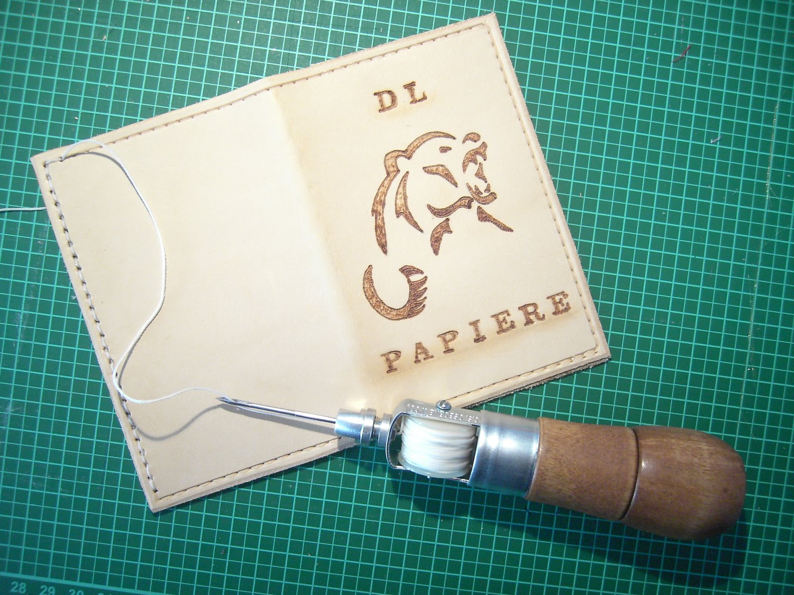 Ich habe mir wieder mal ein paar Lederwerkzeuge bestellt, um mir die Lederverarbeitung etwas zu erleichtern und die Produkte etwas professioneller aussehen zu lassen, vor allem was Nähte und Kanten angeht. Das erste nette ,,Spielzeug", das ich heute morgen ausprobiert habe, ist eine Näh-Ahle, auch automatische Ahle genannt. Mit diesem Werkzeug kann man sehr einfach eine sogenannte Sattlernaht herstellen. Trainingsobjekt war ein Mäppchen für meine Papiere wie Führerschein, Fahrzeugschein etc. Natürlich wieder mit meinem verärgerten Bärchen. ;-)