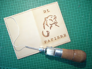 I bought myself some leathercrafting tools to make it easier for me and make the products look more professional, especially the seams and edges. The first nice "toy" I tried this morning while making a leather case for my papers like driver's licence etc., was a sewing awl, also called an automatic awl. This kind of awl is designed for leathercrafting and sewing with two threads. Together with some additional little helpers the seam and the outcome look so good. I'll show you more of them tomorrow. And of course there had to be my little angry bear on the leather case. ;-)