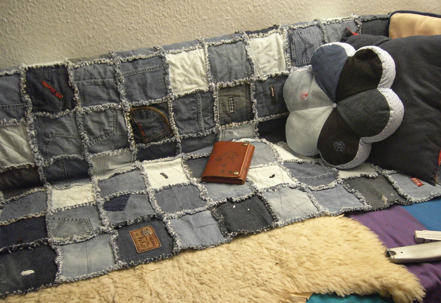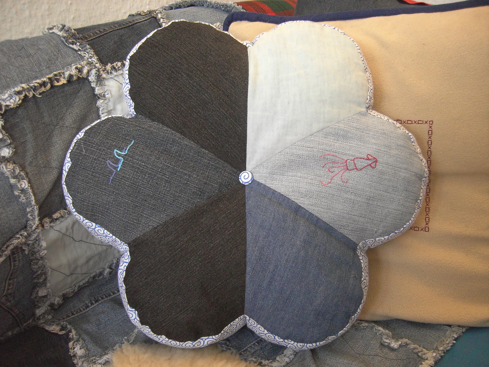 Now I have my own flower cushion, made from recycled jeans, with little embroideries, matching my sofa blanket.