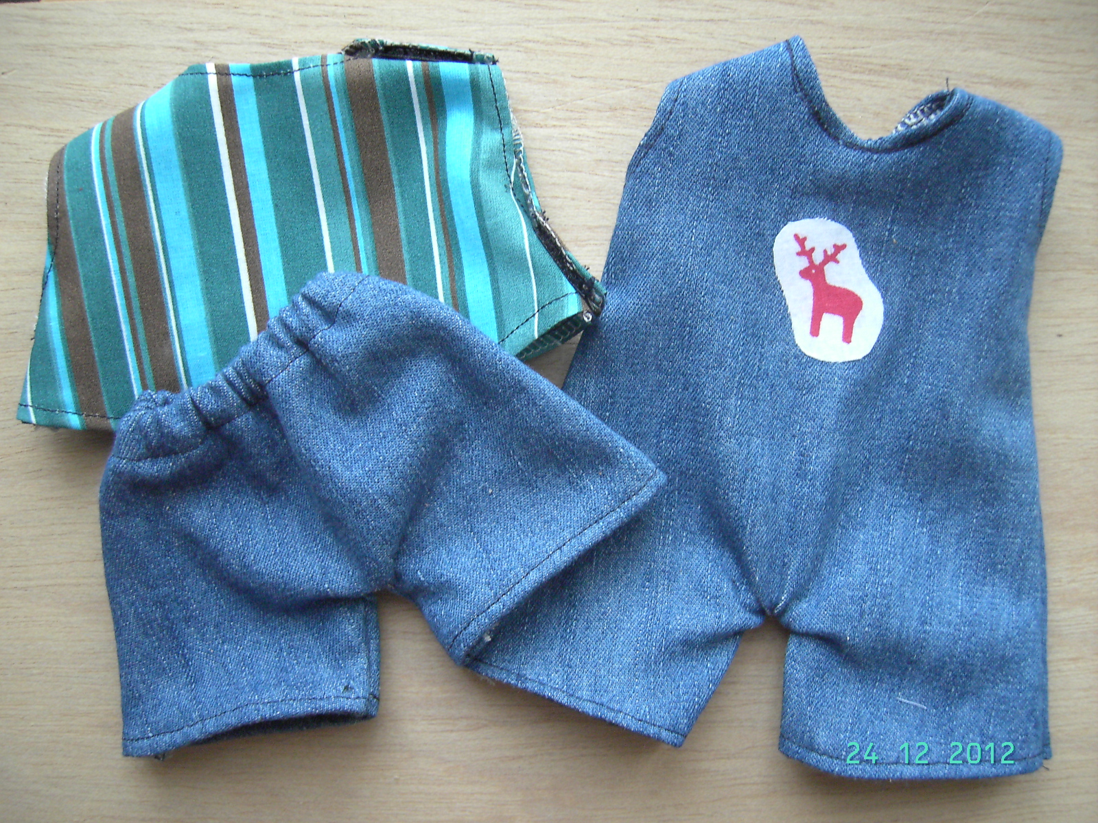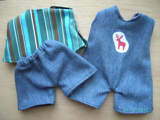 And here's the set for the boy: jeans bib, jeans trousers and striped shirt.