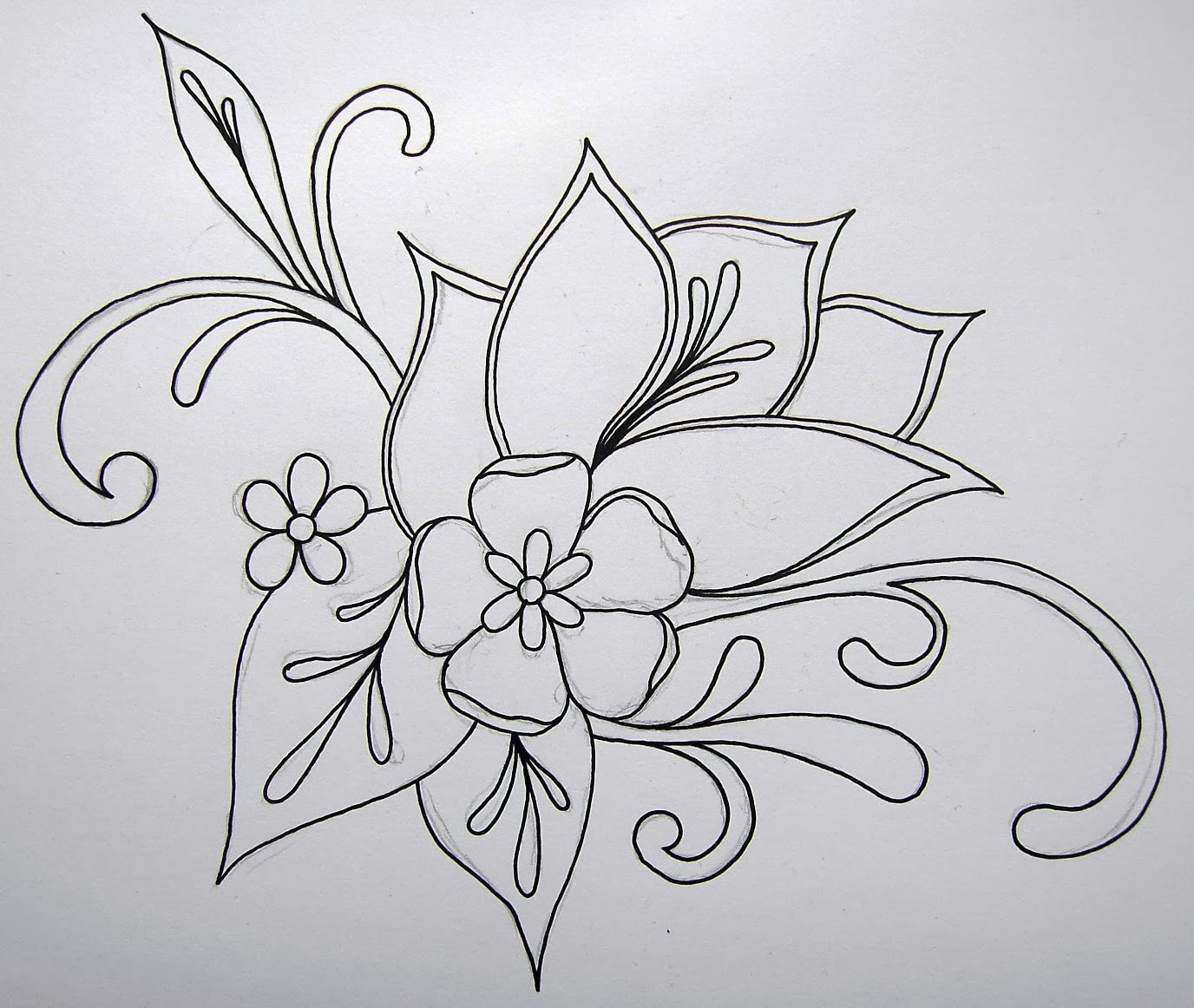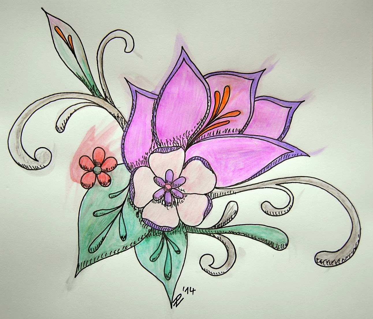 And now on to my ink pens and pocket brushes (which I bought some time ago). I love the deep black they produce which also doesn't fade in light or get pale when erasing pencil lines. I was inspired by a drawing I found on the Internet to make these flowers.