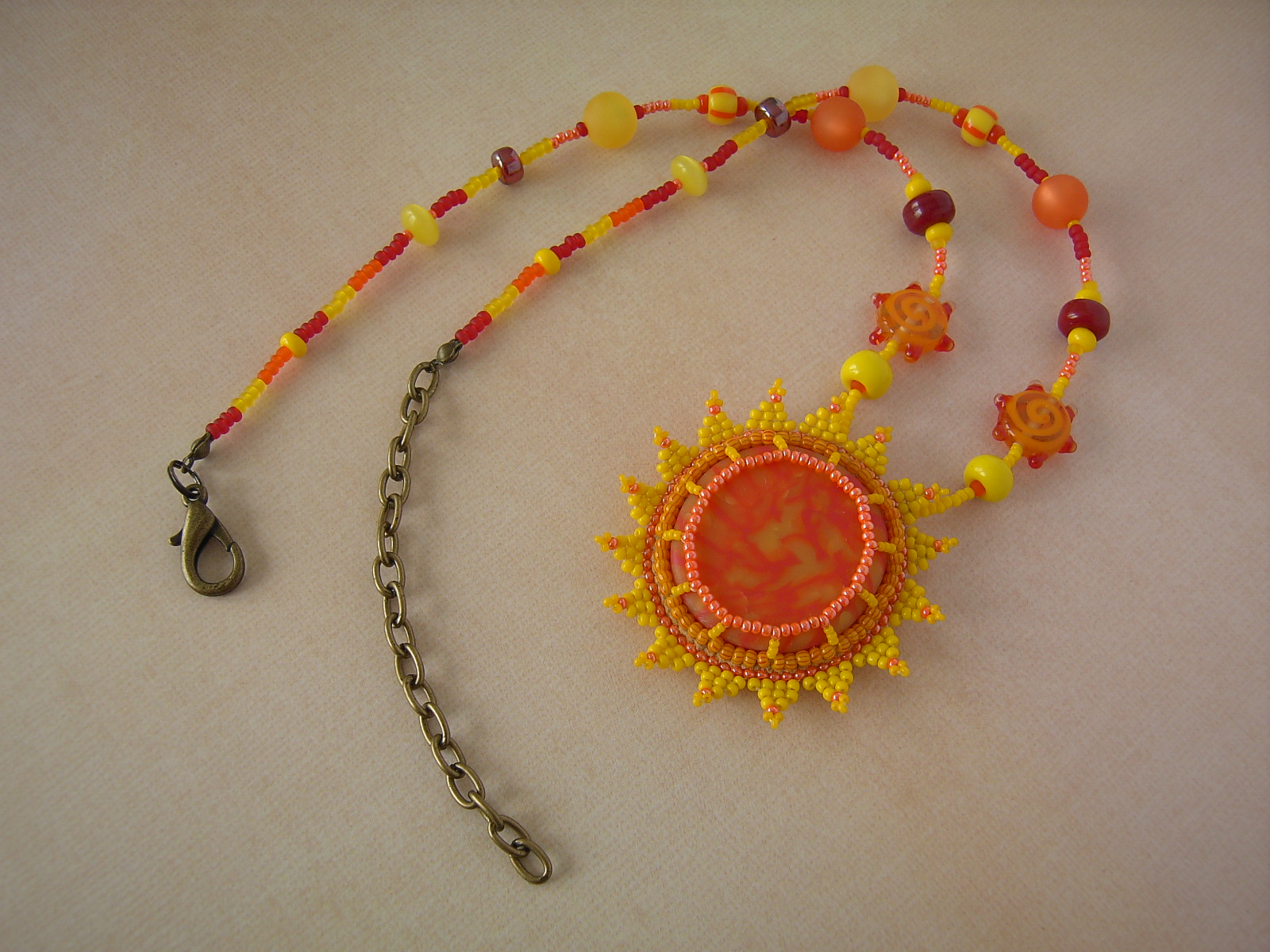 The weather isn't really good lately, at least in my area and so I made my own sun. One of my pc cabs became a sun. The little lampwork suns are a find "by accident" in my bead stash and are simply perfect for the necklace.