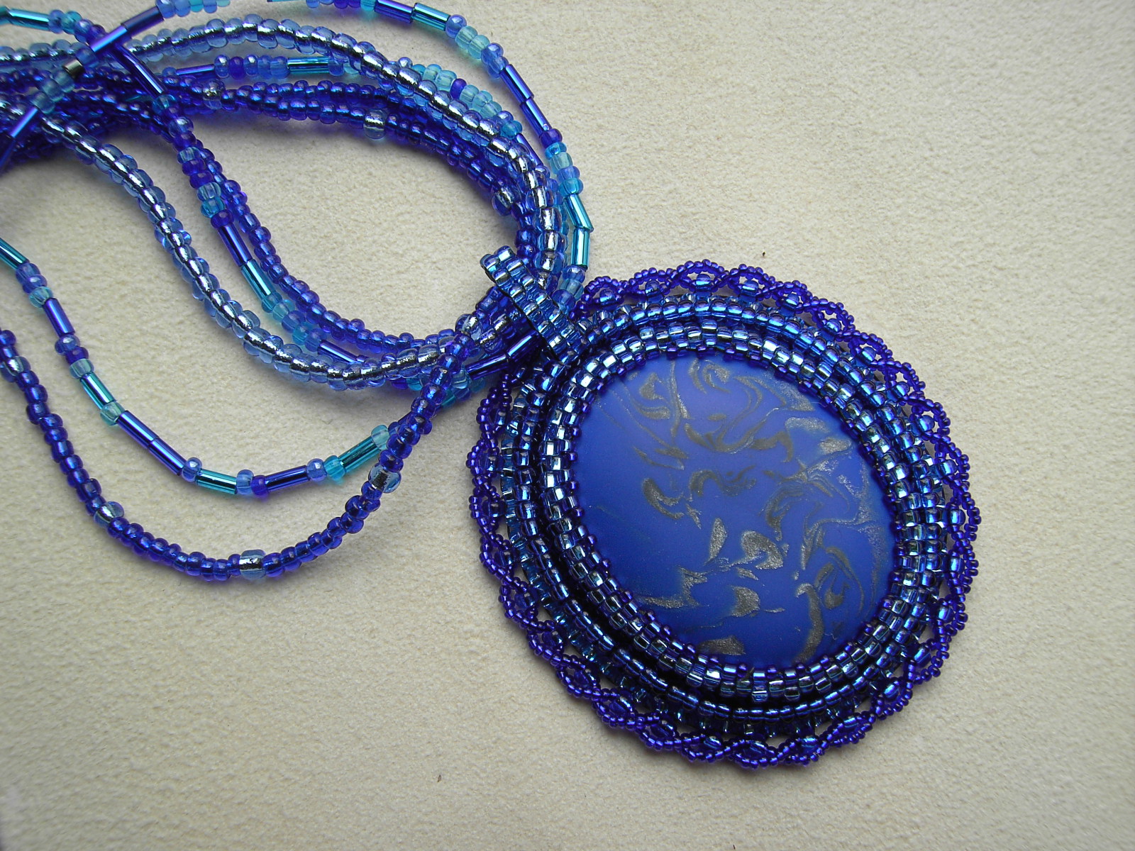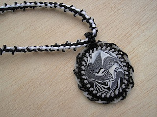 Sooooo, here is another cabochon pendant. It's another one from the the first test series of pc cabs I ever made and this was my favorite from it. A classic combination of black and white! I didn't varnish the cab and so it has a matte surface, therefore I used matte/etched seedbeads to bezel it. The necklace is a kumihimo rope, which I first left without bead embellishment, but that didn't match the pendant. While doing the embellishment, I noticed a nice effect of the embellishment forming a spiral by following the twist of the kumi rope. You can see it in the pic at least a bit. I'm also going to list this necklace in my Artfire shop the next days.