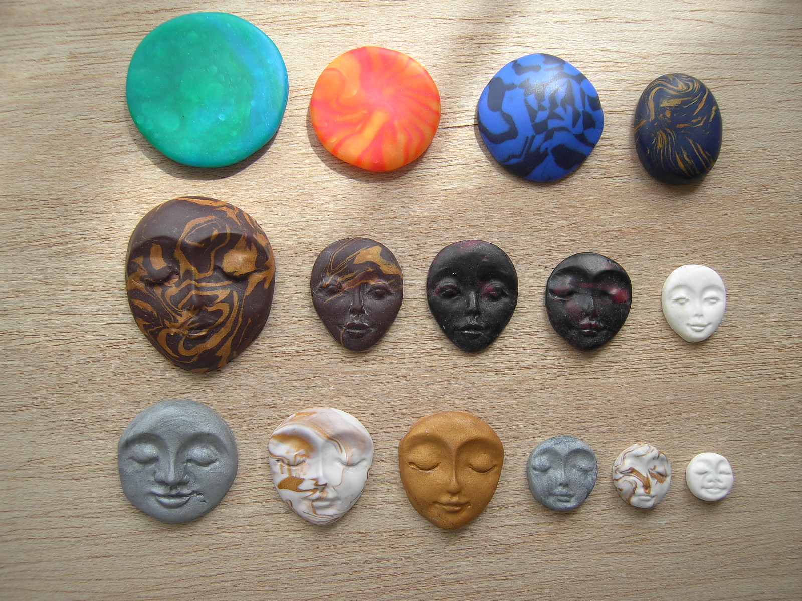 Während ich an den Anleitungen für meine Kurse Ende April schreibe, mußte ich natürlich auch noch was Kreatives nebenher ausprobieren. Und zwar für meine Kurse nächste Winter. Ich werde das Umperlen von Cabochons zeigen und da braucht man natürlich ein paar hübsche Cabochons. Ich habe mal ein bißchen mit FIMO rumprobiert und das sind die ersten Ergebnisse, noch unpoliert und ungeschliffen, aber trotzdem schön.