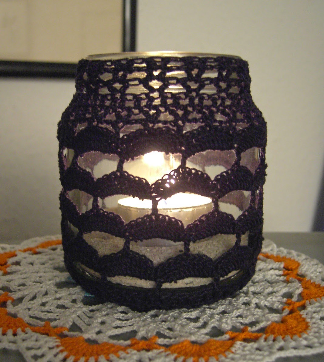 I started with a pattern by my crochet friend Angela called the Tea Light Candle Cosy, but had to modify a bit, as my jar was a bit bigger. I used size 10 crochet thread in dark blue and a 2.00 mm hook. Another one off the gift list. :)
